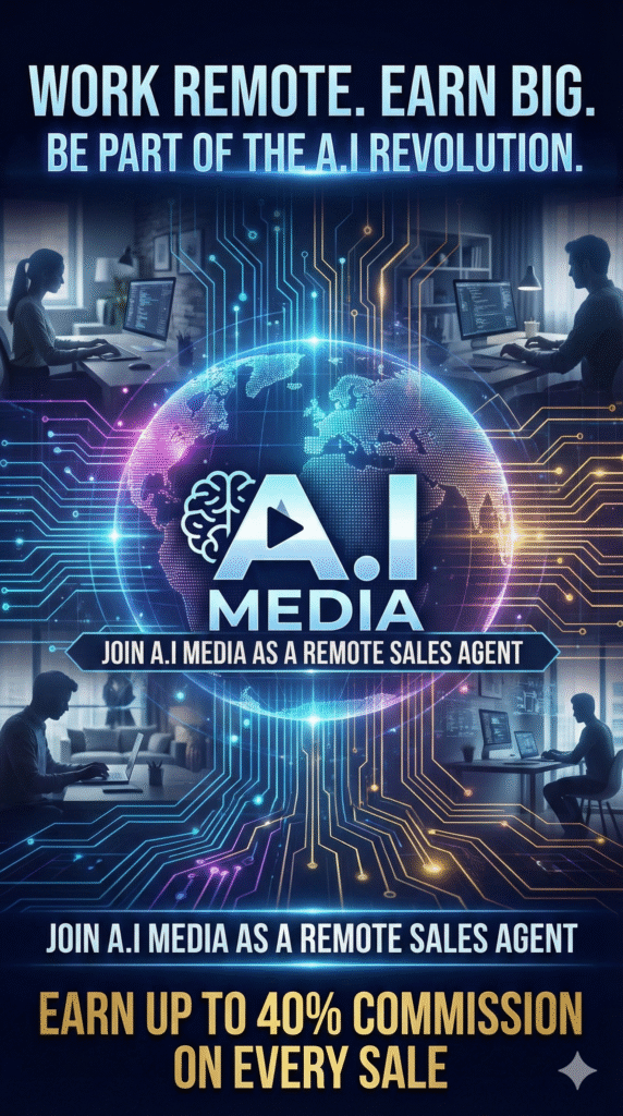 Work Remote. Earn Big. Be Part of the A.I Revolution. Join A.I MEDIA as a remote sales agent and earn up to 40% commission on every sale. Work from anywhere, anytime. All you need is a phone and internet connection. You are never alone. We provide an initial interview, onboarding, and weekly performance training to ensure you have the skills to close deals with World-Class Training.